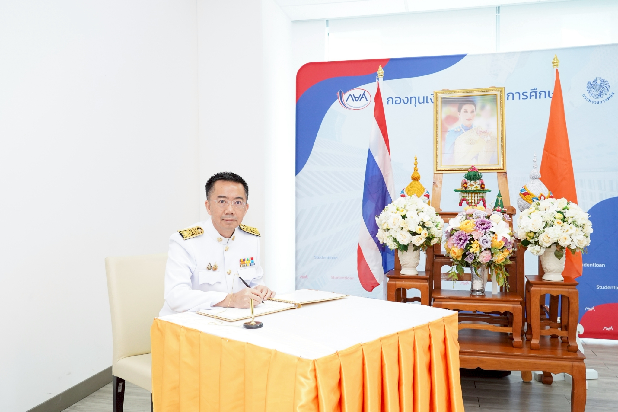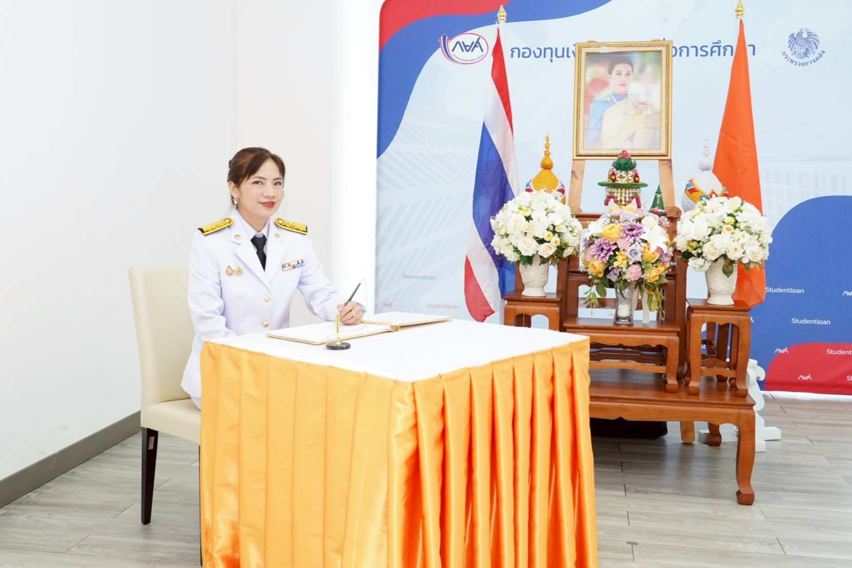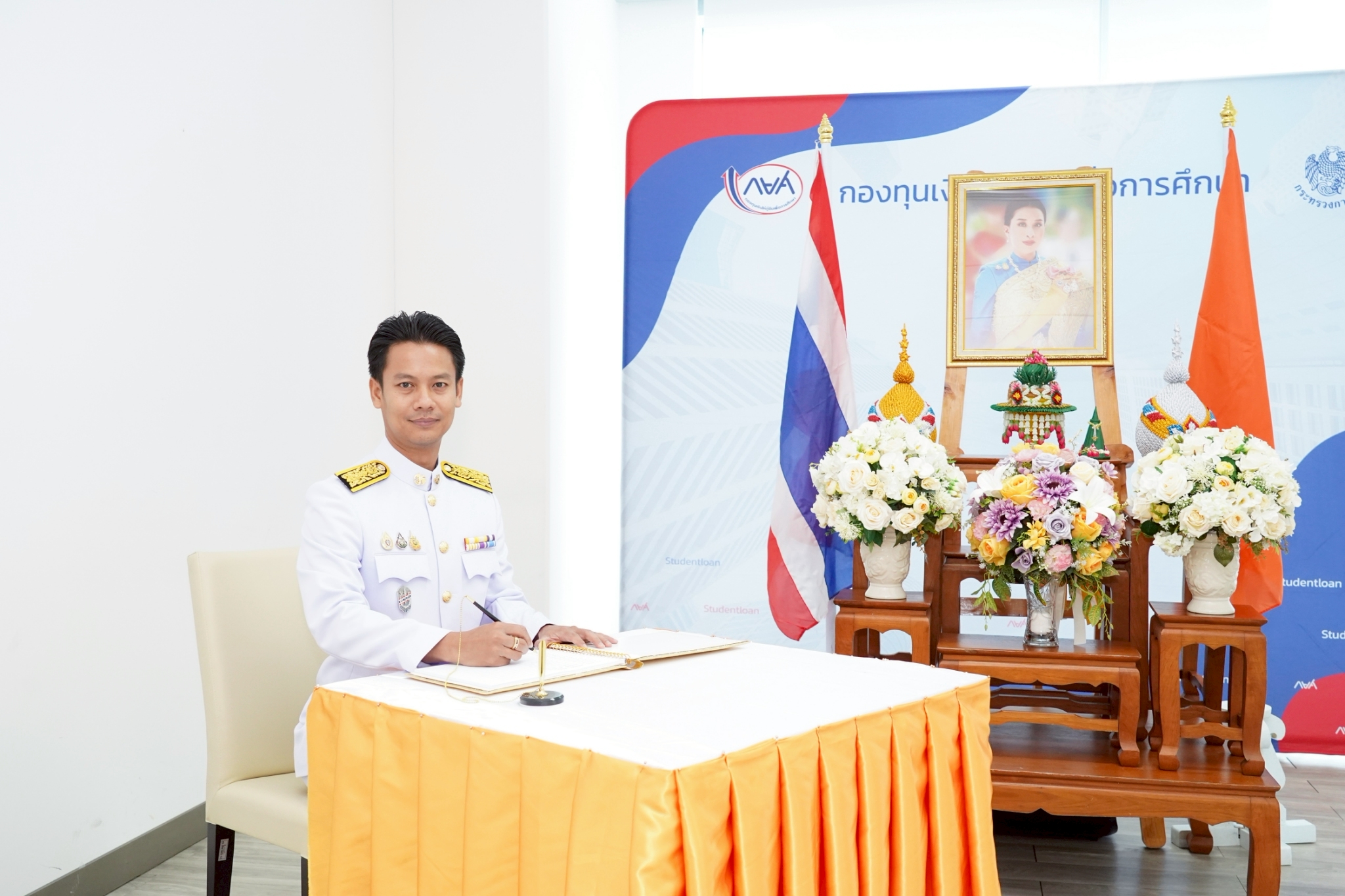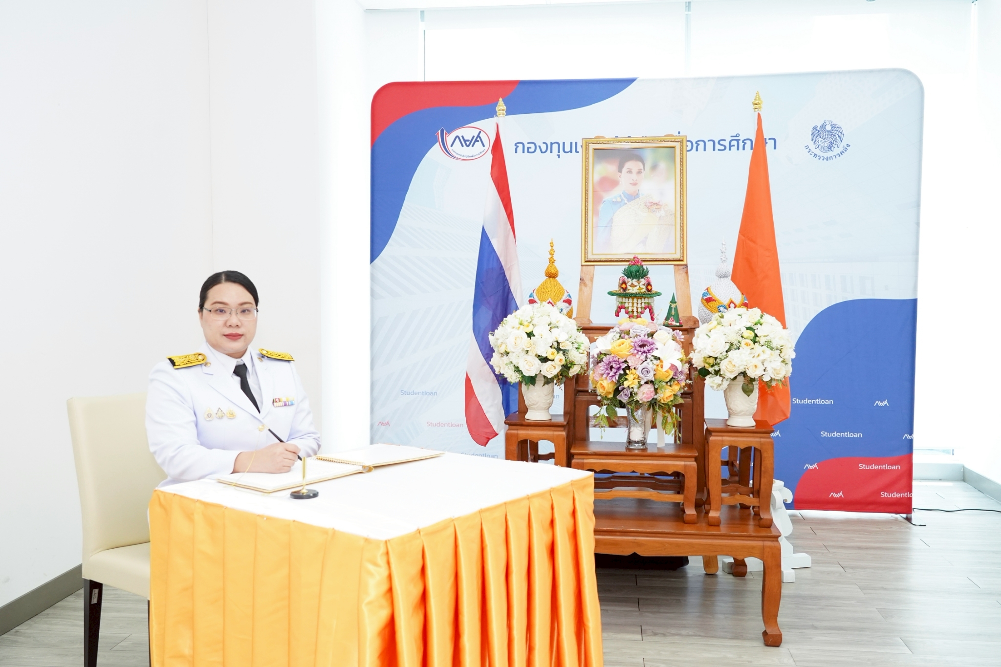 ดร.นันทวัน วงศ์ขจรกิตติ ผู้จัดการกองทุนฯ พร้อมด้วยนางอัญชลี ภูริวิทย์วัฒนา นายอภินันช์ ศุนทรนันท์ นางสาวจิรารัตน์ สุขเกื้อ รองผู้จัดการกองทุนฯ และคณะผู้บริหาร ร่วมลงนามถวายพระพร สมเด็จพระเจ้าลูกเธอ เจ้าฟ้าพัชรกิติยาภา นเรนทิราเทพยวดี กรมหลวงราชสาริณีสิริพัชร มหาวัชรราชธิดา ขอให้ทรงหายจากพระอาการประชวร และมีพระพลานามัยแข็งแรงโดยเร็ววัน เมื่อวันที่ 30 กันยายน 2568 ณ สำนักงาน กยศ.